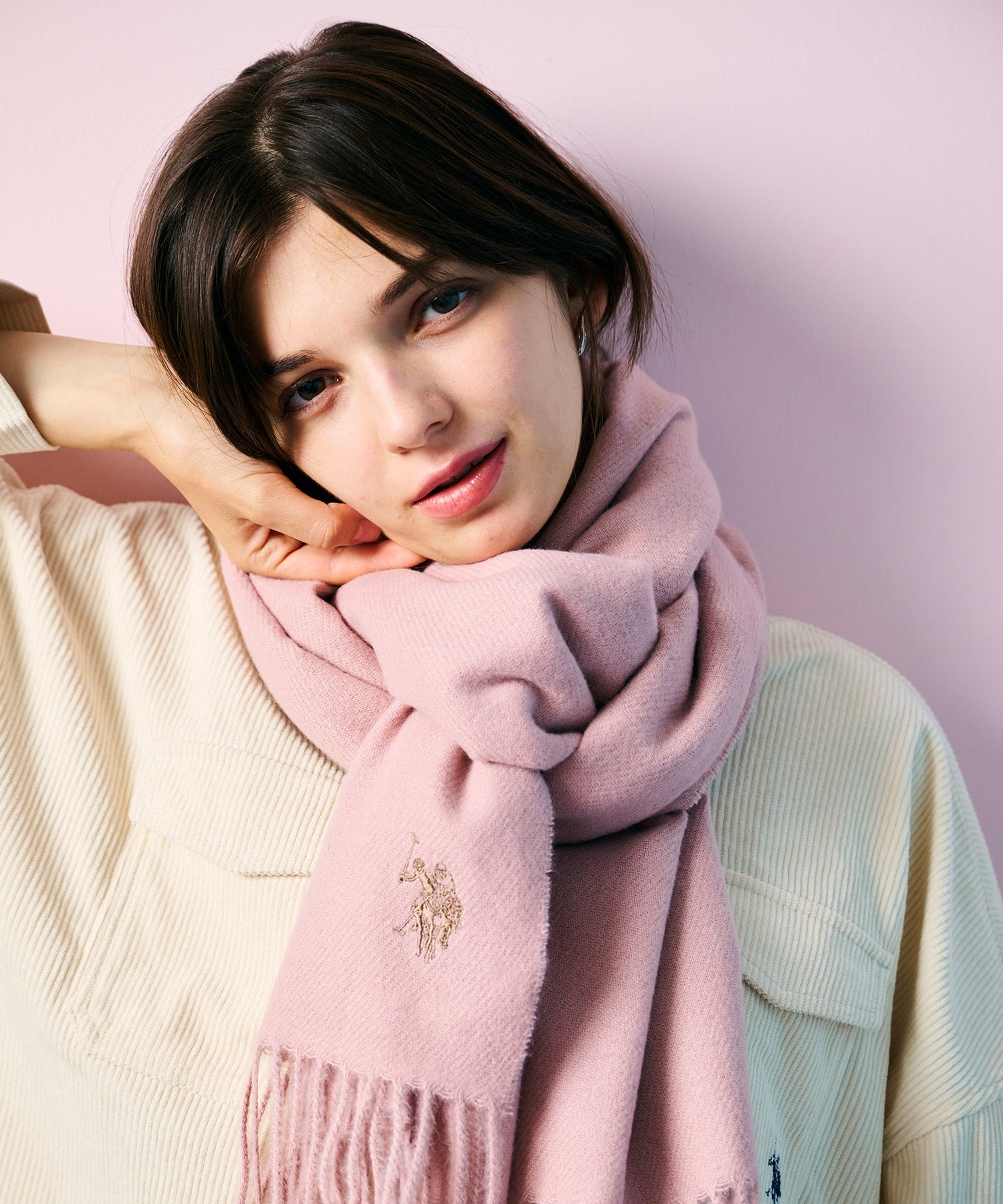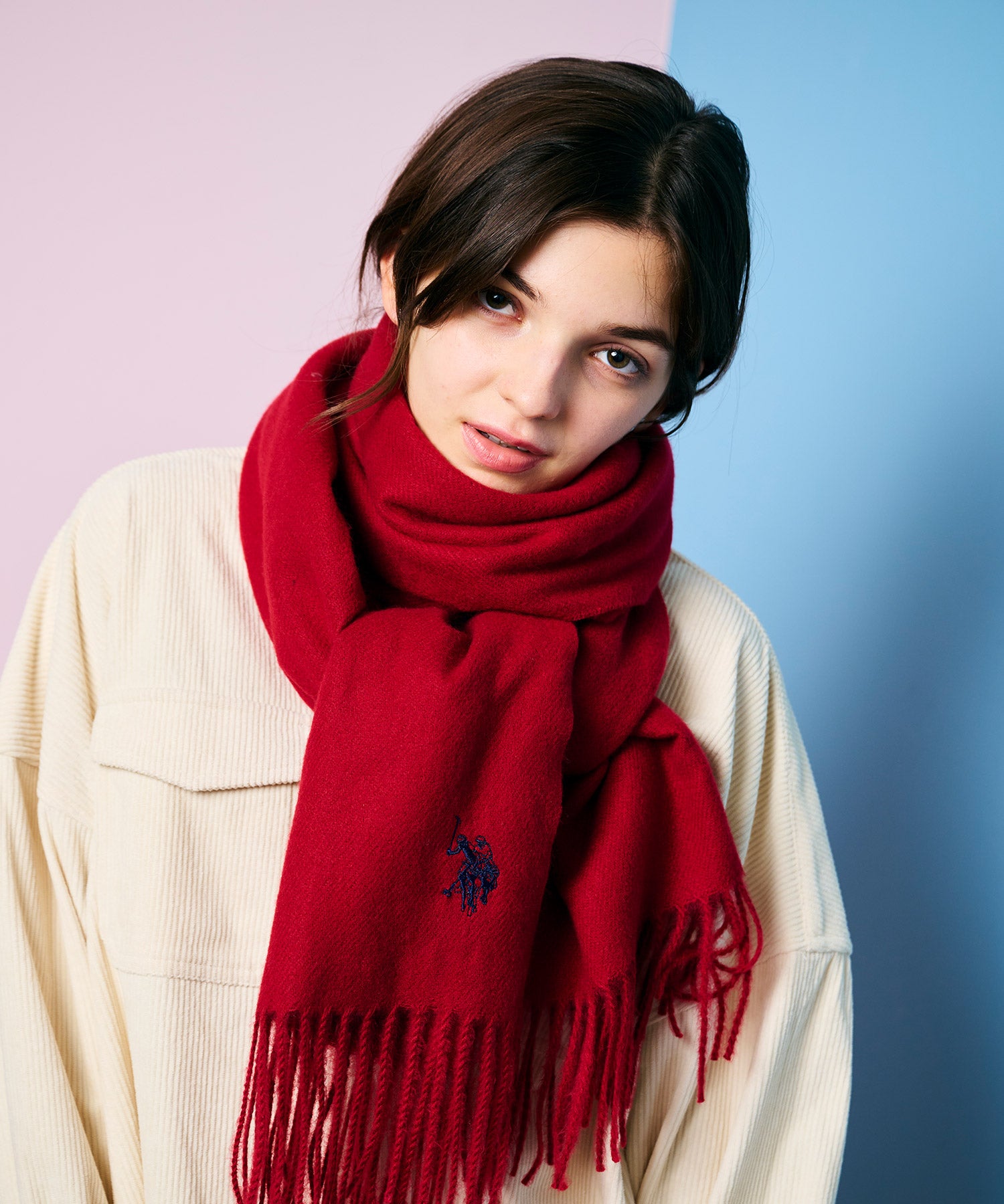 トレンド性のあるロゴ刺繍が施されたオーバーサイズのマフラーが登場。