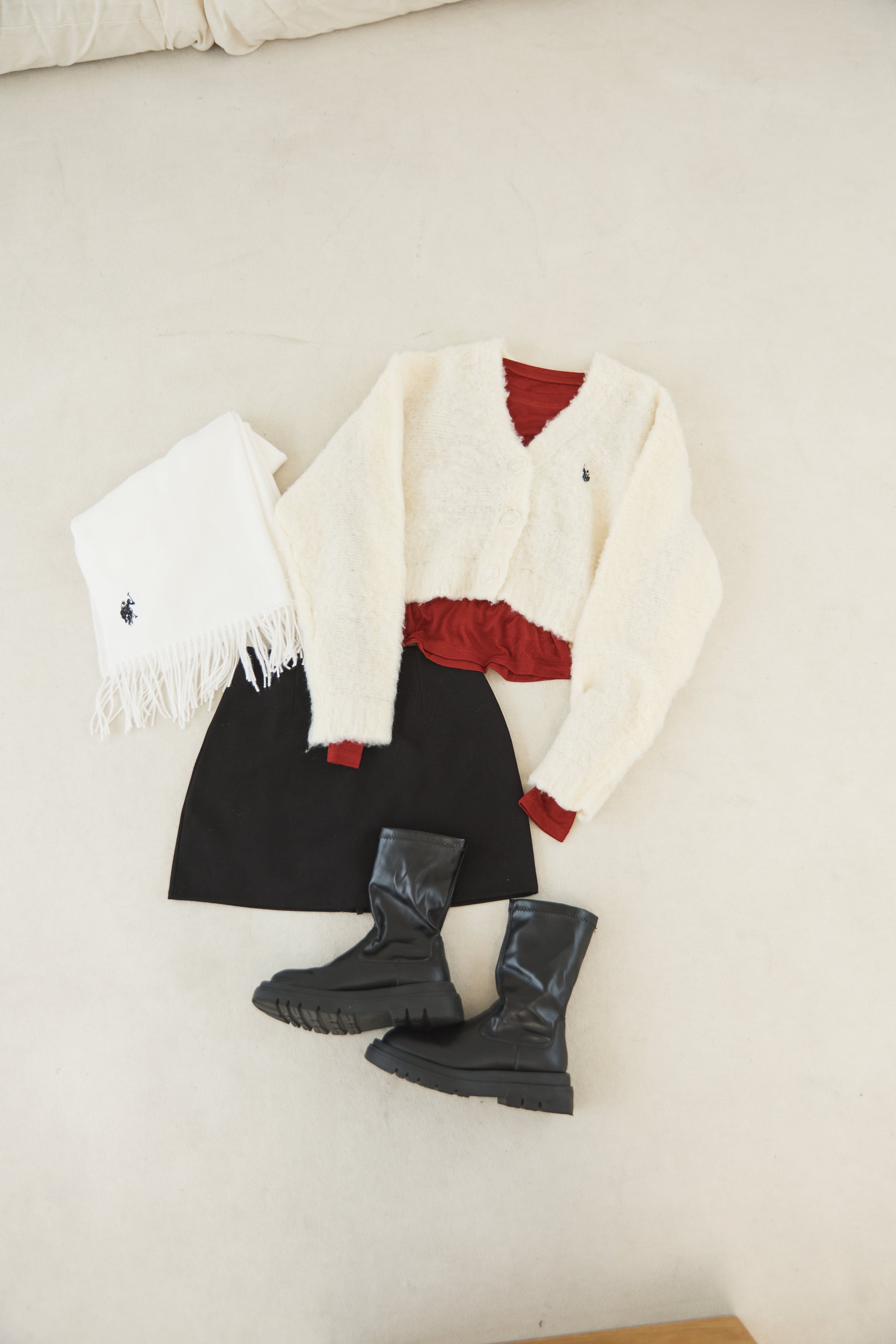 起毛感のあるシャギーニット素材を使用し、肌触りの良さと軽やかな着心地を実現。柔らかく包み込むような風合いで、シーズンムードを高めてくれます。